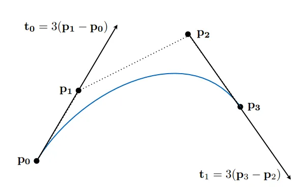 与末端线段相切:b'(0) = 3(b_1 - b_0); b'(1) = 3(b_3 - b_2)