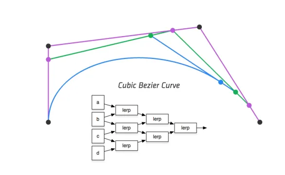 构造一个三次方贝塞尔曲线需要总共四个输入,都递归使用线性插值