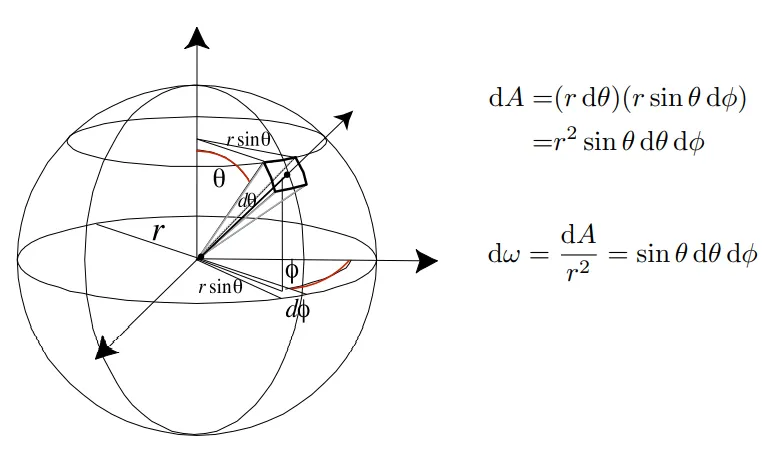 )发生改变时,会在对应方向的球面上框出一片区域,该区域对应的立体角即为微分立体角